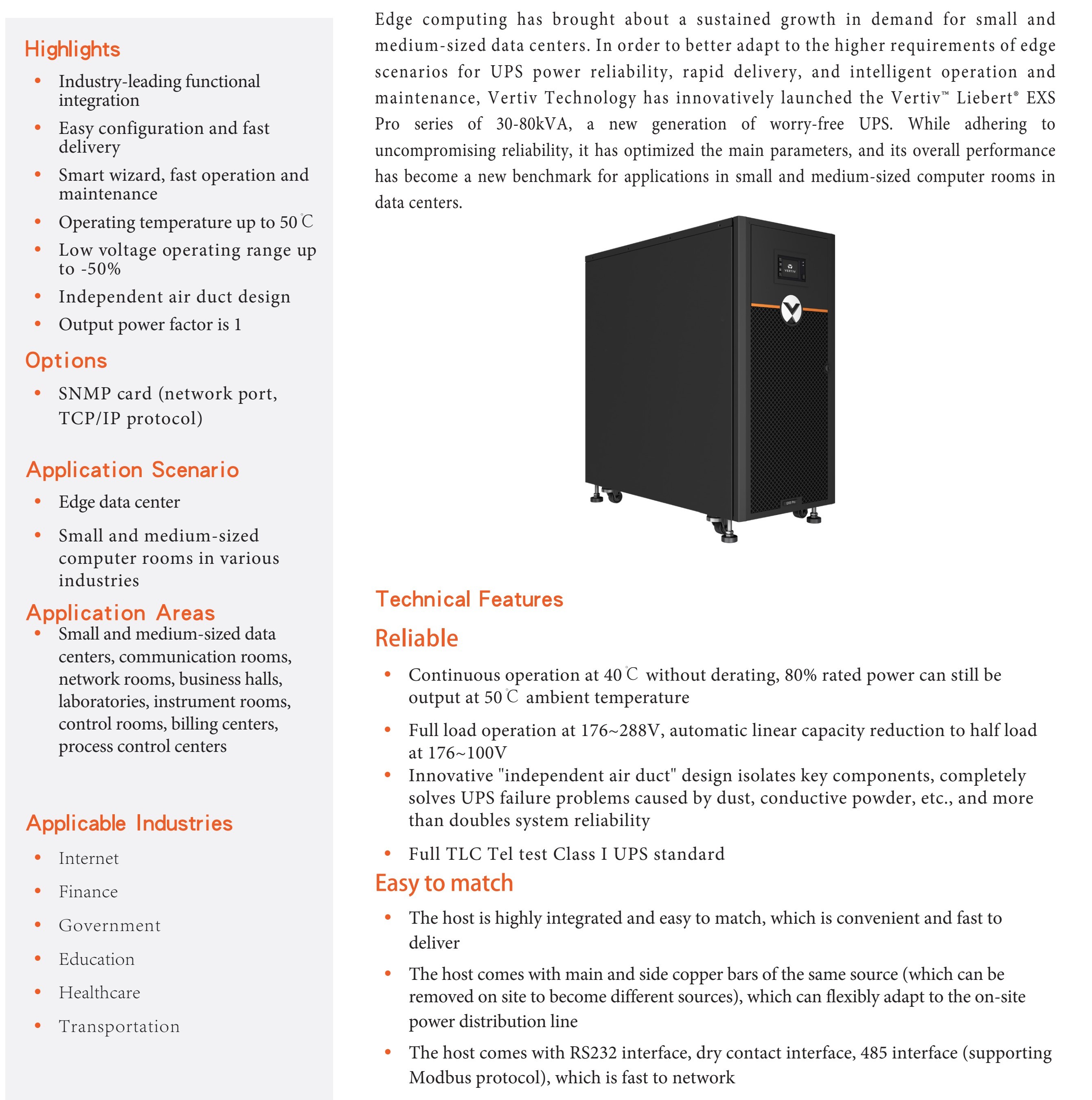Vertiv Liebert EXS PRO 30KVA 40KVA 60KVA 80KVA 380V UPS ثلاثي المراحل على الإنترنت البرج UPS لشبكات مراكز البيانات